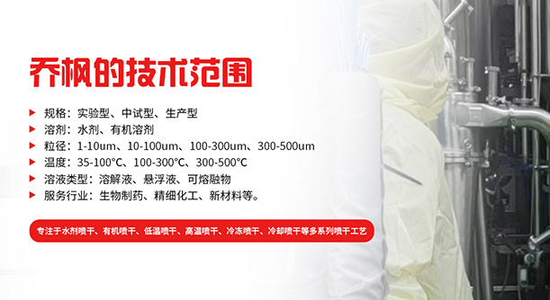 上海喬楓實業有限公司,成立于2012年,是從事噴霧干燥設備的研發設計、生產、銷售(小型噴霧干燥機實驗型噴霧干燥機35℃低溫噴霧干燥機有機溶劑噴霧干燥機,低溫閉式循環噴霧干燥機、超細粉末噴霧干燥機、噴霧冷凍干燥機、真空噴霧干燥機氣流噴霧干燥機噴霧造粒干燥機,離心噴霧干燥機,沸騰制粒機等)和售后于一體的綜合性公司,本公司現成為一家致力于為生物制藥、精細化工、新能源、陶瓷造粒及食品工程等領域提供全套解決方案的整線交鑰匙工程企業。